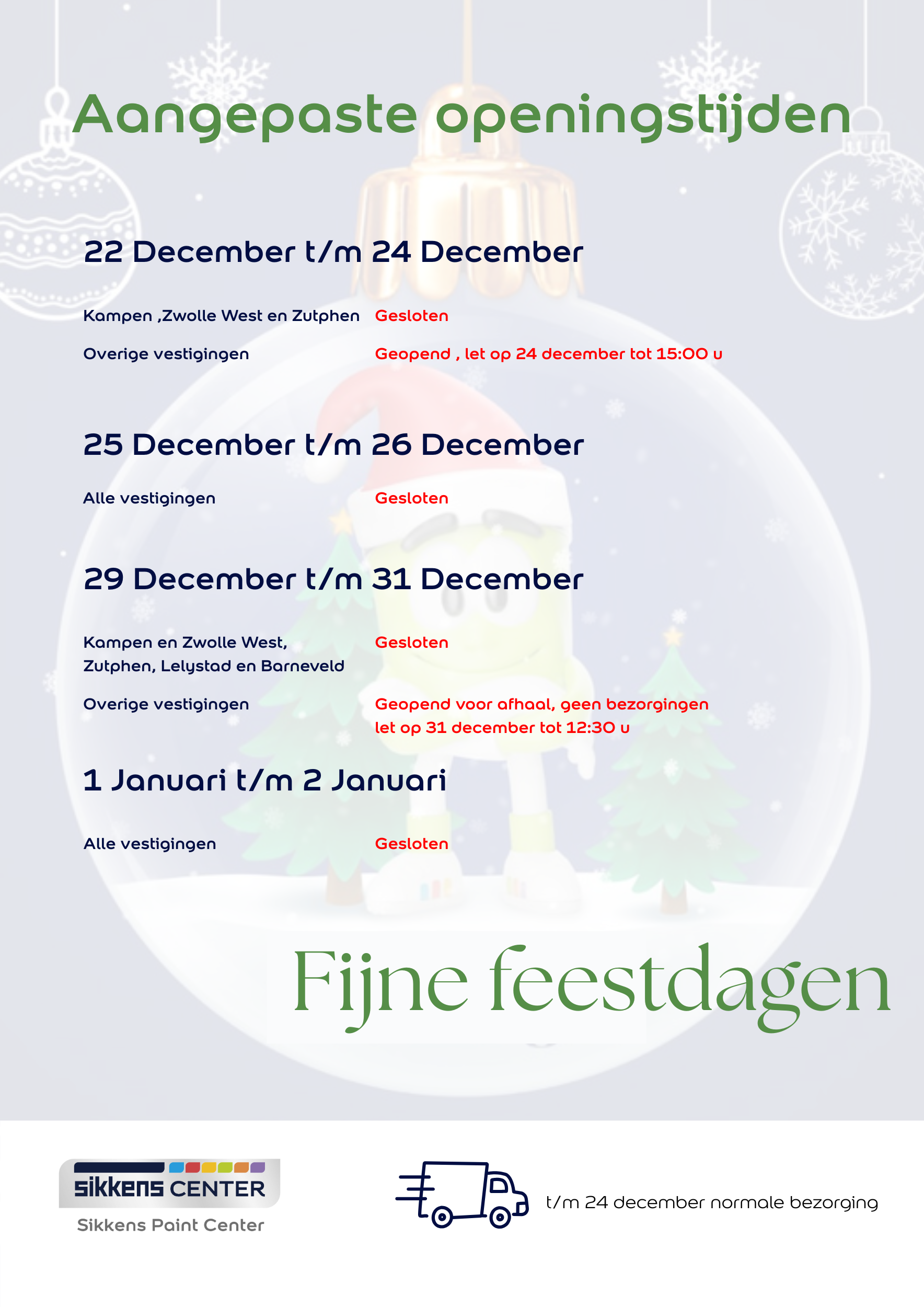 Tijdens de feestdagen hanteren wij aangepaste openingstijden. Wij hebben het zo ingedeeld dat je bijna alle dagen om de feestdagen heen geholpen kan worden. Kijk hier wat dit betekent voor jou favoriete vestiging.